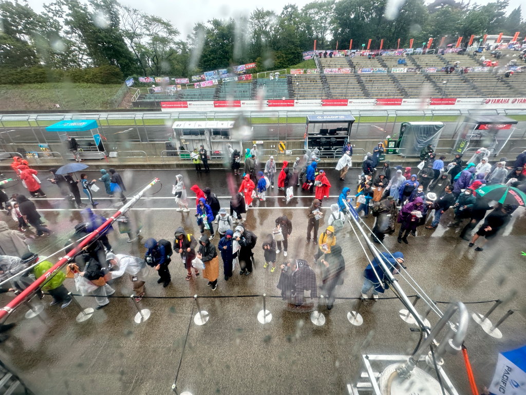 雨の中、ファンの皆さんがピットウォークを楽しんでいらっしゃるのを室内から見た様子