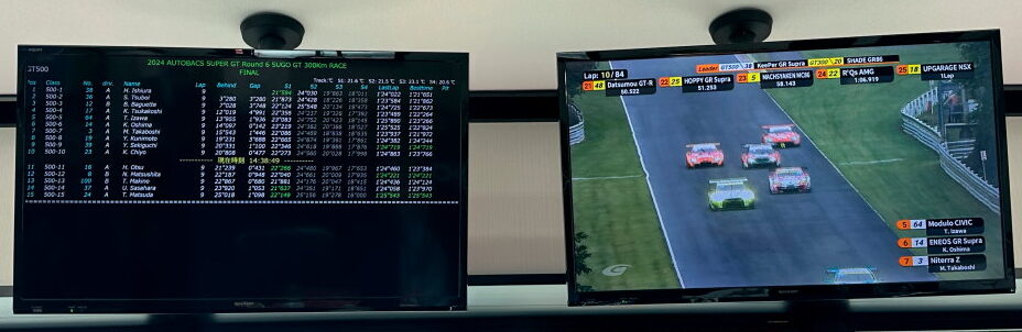 NISMOのホスピタリティルームに戻った我々は、サーキット会場内のオフィシャル映像、順位、それにチーム独自のオンボード映像をモニターで観戦できます。