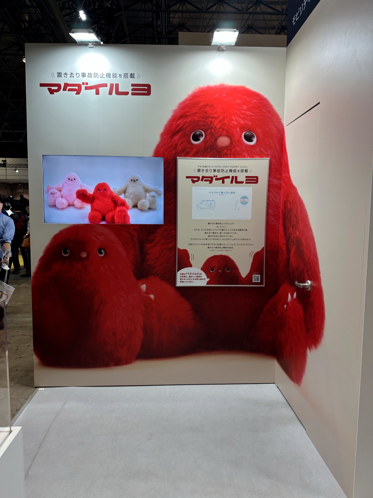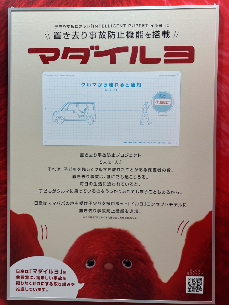 追加でもう一つ。日産が展示していた「マダイルヨ」。個人車両、送迎バス含め、昨今、幼児の置き去り事故が減少するどころか増えているようにすら感じます。マダイルヨは、日産がアカチャンホンポとコラボしてできた「イルヨ」コンセプトに置き去り防止機能を追加したもの。「イルヨ」は、例えば後席のチャイルドシートに載せた子供を、運転中の親に代わってあやしてくれるといったもの。
