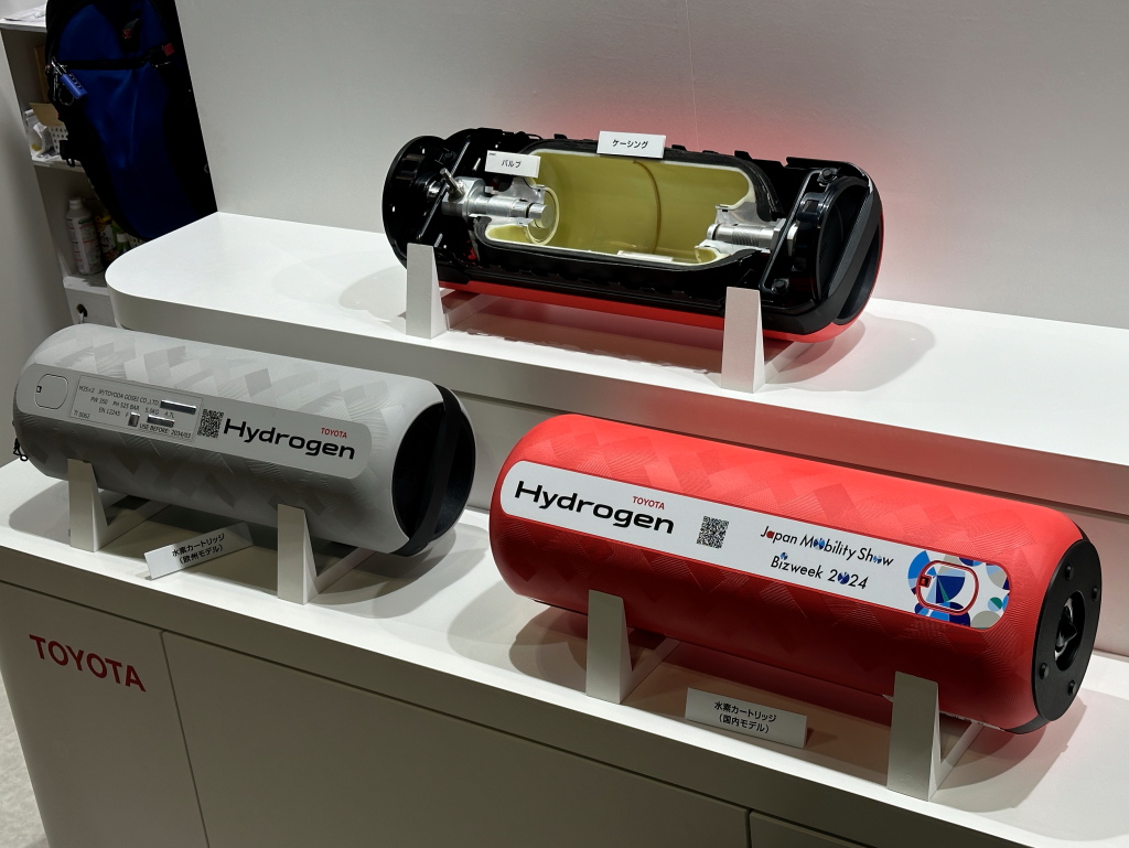 今回、この他に、カセットボンベガスのように、家庭でも使えそうなコンパクトな水素ボンベも出展。かつてはBMWでも研究中で、僕は30年ほど前に内燃水素燃料機関搭載した7シリーズに旧JARI高速周回路で同乗したことがありますが、その時点でもいうまでもなくガソリンと変わらぬ走りを見せていましたが、貯蔵が一番の問題だったのでしょう、その後は続いている話はニュースとして聞こえてきません。気体の場合、エネルギー密度は圧力を上げるしかありませんが、貯蔵の方法はどうやら目処が見えたと言えるんじゃないでしょうか。あとは、どうやって発生させ、どうやって供給するかが構築できれば、水素は貯蔵さえできれば如何様にも使い道がある燃料と言えるでしょう。