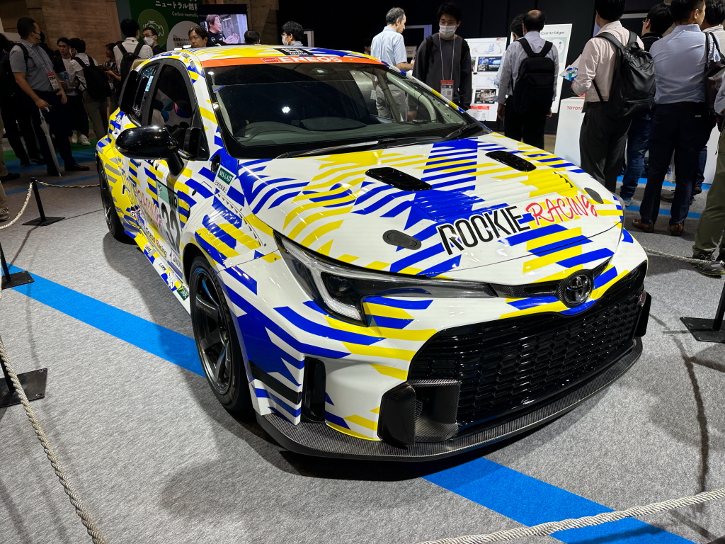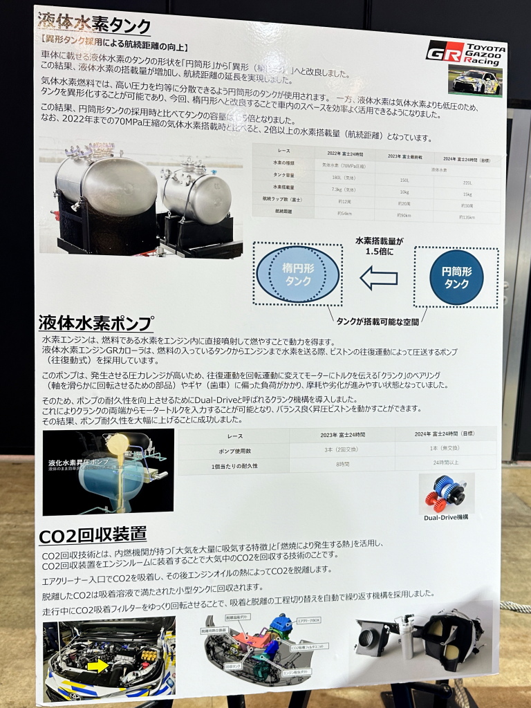 トヨタは例によって水素燃料で、耐久レースに参戦中のカローラを展示。水素燃料電池でなく、燃料としてレシプロエンジンのシリンダー内で燃焼させる燃料として水素を使用する。水素を燃やすエンジンの研究の歴史は、ガソリンに代わる代替燃料として始められたと思われるが、大きな課題としては、原子番号1番であることからわかるように、水素は通常それだけで存在している時の分子サイズが世の中で最も小さい。実は、内燃機関自体の基本原理はそのままでアトキンソンサイクルで回すことができるものの、その分子サイズの小ささから水素は隙間から漏れるだけでなく、金属であろうとその素材の分子間に入り込み腐食させる。故に、燃料系を腐食に強いものにする必要があるが、貯蔵タンクは難しいものがあり、かつては魔法瓶に冷却状態で液体水素にするか、燃料吸蔵合金によって貯蔵するかと三十数年前は言われていた。これが、FCV用水素ボンベを使って内燃機関の燃料とすることができるようになわけですが、その進化具合を展示してありました。