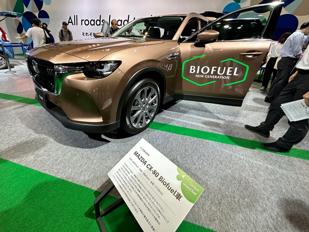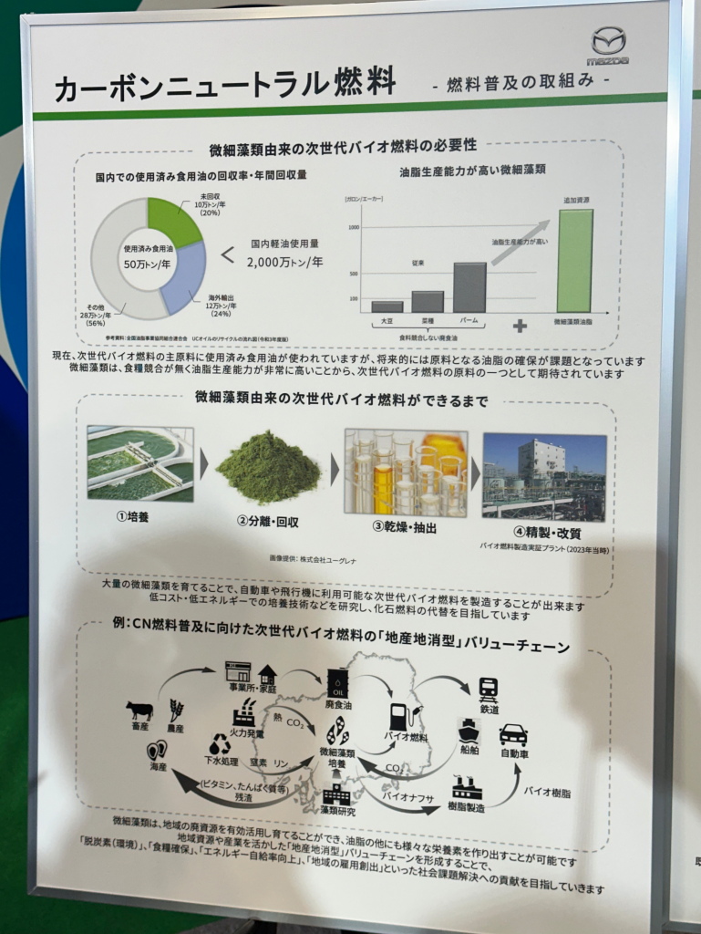 マツダは、以前から研究・開発を続ける藻(も)によるバイオ燃料を新しいCX-80とともに展示していました。