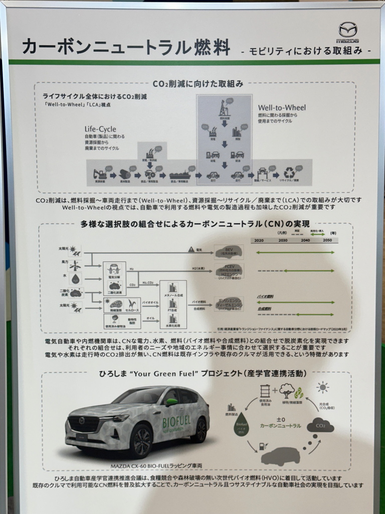 藻由来で作り出すバイオ燃料は、分子中の炭素鎖数が比較的多く、ガソリンよりも軽油を作り出すのに適していることで、現行ディーゼルエンジンにそのまま使えるとのことで、CX-80のディーゼル車を「カーボンニュートラル車」として出展していたわけです。