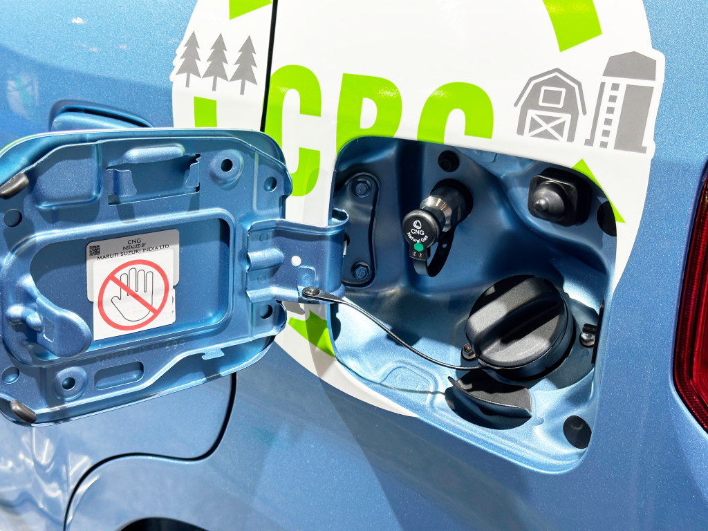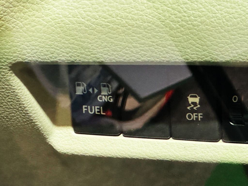 今回展示されていたマルチスズキ・ワゴンRは見ての通り日本のワゴンRとはまったく別物。軽自動車を拡大したものでなく、プラットフォームはイグニスなどと共通なのだとか。そのフューエルリッドを開けると、注入口が2つ、ガソリンとガスのそれぞれを見ることが出来ます。また、ダッシュボード右側(インドは英国領だった歴史から右ハンドル)には、ガソリン-ガスの燃料切り替えスイッチが付いています。これら部分は特に改造したわけではなく、もともとCNG対応車の「ノーマル」状態なのだそうです。