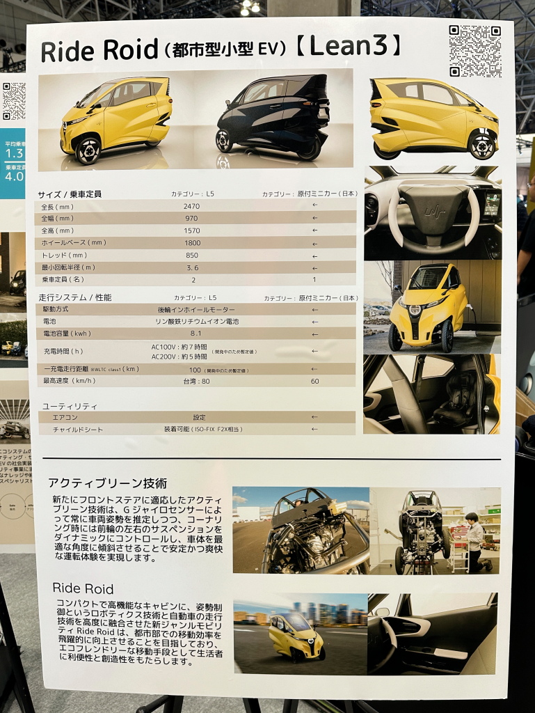 代替燃料系ではありませんが、もうひとつ、気になったのが、リーンモビリティ社の小型EVのRide Roidカテゴリに属すると宣言する「Lean3」。かつてトヨタで開発されていたi-ROAD(アイロード)の言わば進化&市販バージョンがいよいよローンチされる模様です。