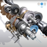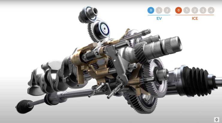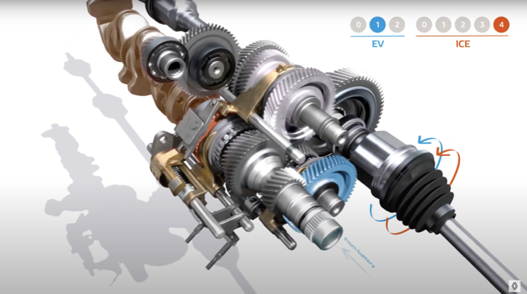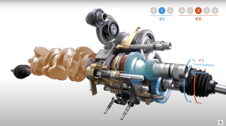 逆にちょっとでも「駆動力は要らない」状態、例えば加速の中でアクセルペダルが戻り、コースティング状態に移って大丈夫、というその瞬間にエンジンは止まり、駆動ゼロ〜回生に移行する。つまりエンジン→変速機構へのドグクラッチをその瞬間に”抜いて”いる。ここもまったくショックレス。でも伝達トルクをゼロにしないとドグは抜けないし、抜くとショックが出る、はずなのに、それらしい感触さえない。滑らか、即時。