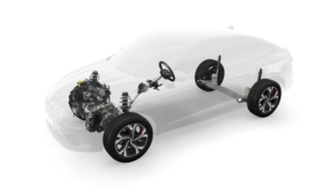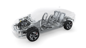 商品企画としては、エクステリア・スタイリングに端的に表現されているように4ドア・クーペ・スタイルのクロスオーバーSUV。ヨーロッパとしてはミディアムサイズ。ハイブリッド動力システムの内容と仕上がりについては後で他の車種も含めて詳しく語るとして、まずこのモデル単体のパッケージング・レイアウトから述べておくと、とくに気をてらうこともなくストレートに組み上げた今日的SUVのキャビン及び全体のレイアウト。すなわち、運転席でもフロアが路面に対してやや高め。一般の乗用車系からするとおそらく50〜70mmほどは高い印象。その上にペタリと低く座るのでもなく、ややHP設定は高めに、フロアパネルの上でシートレールを支持している横方向のビームが30mm程度は高く上に張り出していて、シートレールはその上に乗っている。これでシートの上下調節を最も低い位置にしても、踵が少し下に落ち、膝の折れ角も少し大きめになる、そういうポジションに落ち着く。