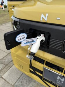 もう一つ装着されていた充電インジケーターですが、社外から充電の様子が一目でわかると言うもの。これもアプリなどによって外で知ることができるわけですが、まぁいちいちスマホのアプリを立ち上げることなくぱっと見で充電状況がわかると言うのは親切なものです。これも標準装備にしなかったのは商用電気自動車のあるべき姿、どこまで必要かをホンダが考えた結果なのでしょう。ホンダアクセスさんとしては商売の幅が広がりますね。