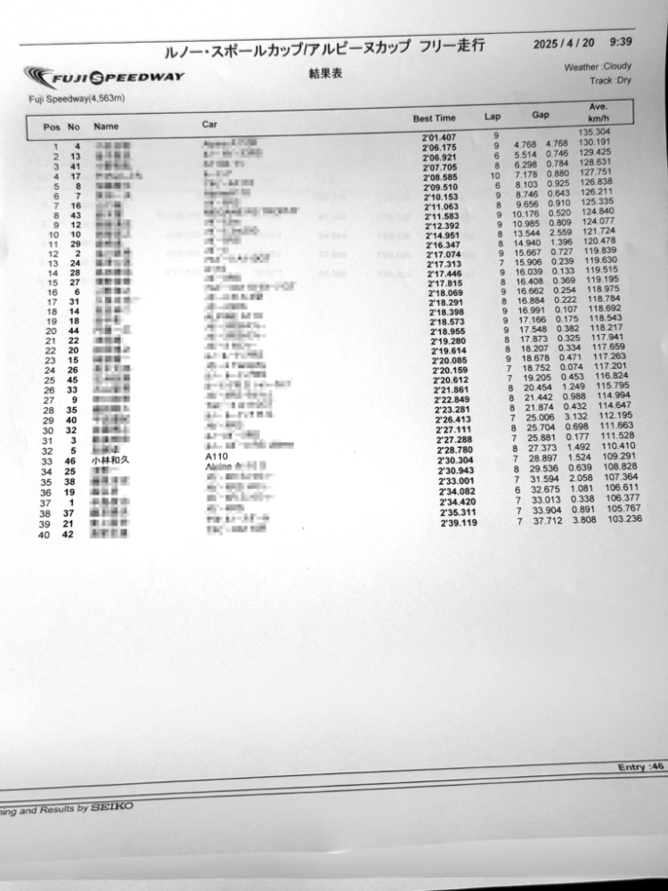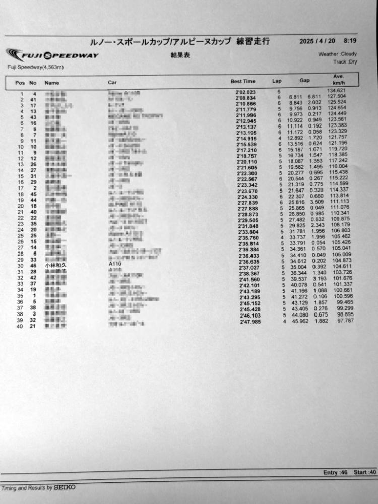 Cパドックに戻り、ゼッケンと計測器を外し、プリントされたラップタイム集計表を受け取ります。恥ずかしながら最速ラップは、2分28秒780でした。FSW現コースでのコースレコードは、2008年のF1にてフェリペ・マッサがフェラーリF2008で記録した1分17秒287ですので、その倍近くです。